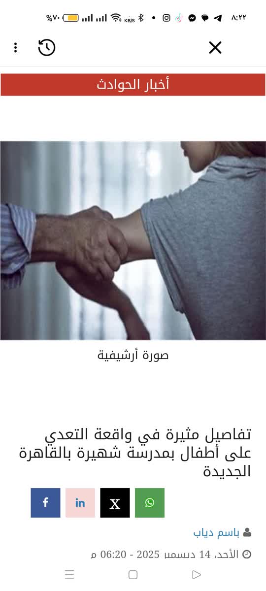 logo متهم ثانٍ في واقعة التجمع.. النيابة تحبس فرد أمن جديد بتهمة التحرش بالأطفالlogo أرض الزمالك بـ6 أكتوبر..النيابة تكشف التفاصيل وتحقيق موسع بشأن إهدار المال العامlogo تحت رعاية التضامن..محافظ دمياط يطلق مبادرة أمان ودفا ويبحث توفير دخل ثابت للأسر المستحقةlogo لتعزيز الفكر الوسطي..أوقاف القليوبية تختبر خطباء المكافأة على الإلقاء والمحتوى الشرعي السليمlogo دعوة للمشاركة..القليوبية تنهي استعداداتها لجولة الإعادة وتناشد المواطنين ممارسة حقهم الانتخابيlogo استجابة لشكاوى المواطنين..جولة مفاجئة لمحافظ الغربية تنهي أزمة القمامة وتلزم رئيس الحي بالمتابعة logo مدافع ليفربول يوجه رسالة لـ محمد صلاحlogo شراكة مصرية - قطرية لإنتاج وقود الطائرات المستدام بالسخنةlogo القليوبية تشهد ثورة في مشروعات المياه: محطة «شبلنجة» تعمل لأول مرة بتقنية الترشيح الفائق logo وزير الداخلية يعتمد نتيجة كلية الشرطة للدفعة الجديدةlogo تحرك حكومي لمعالجة التحديات المالية بماسبيرو والصحف القوميةlogo مذبحة بأستراليا.. 5 قتلى وإعلان مقتل أحد المنفذينlogo سوق "اليوم الواحد" بالمرج..انطلاقة جديدة للتسوق المباشرlogo استجابة للأحوال السيئة.. «زاد العزة» الـ93 تصل غزة بمساعدات شتويةlogo الأرصاد تحذر: انخفاض حاد في درجات الحرارة وأمطار على هذه المحافظات logo متهم ثانٍ في واقعة التجمع.. النيابة تحبس فرد أمن جديد بتهمة التحرش بالأطفالlogo أرض الزمالك بـ6 أكتوبر..النيابة تكشف التفاصيل وتحقيق موسع بشأن إهدار المال العامlogo تحت رعاية التضامن..محافظ دمياط يطلق مبادرة أمان ودفا ويبحث توفير دخل ثابت للأسر المستحقةlogo لتعزيز الفكر الوسطي..أوقاف القليوبية تختبر خطباء المكافأة على الإلقاء والمحتوى الشرعي السليمlogo دعوة للمشاركة..القليوبية تنهي استعداداتها لجولة الإعادة وتناشد المواطنين ممارسة حقهم الانتخابيlogo استجابة لشكاوى المواطنين..جولة مفاجئة لمحافظ الغربية تنهي أزمة القمامة وتلزم رئيس الحي بالمتابعة logo مدافع ليفربول يوجه رسالة لـ محمد صلاحlogo شراكة مصرية - قطرية لإنتاج وقود الطائرات المستدام بالسخنةlogo القليوبية تشهد ثورة في مشروعات المياه: محطة «شبلنجة» تعمل لأول مرة بتقنية الترشيح الفائق logo وزير الداخلية يعتمد نتيجة كلية الشرطة للدفعة الجديدةlogo تحرك حكومي لمعالجة التحديات المالية بماسبيرو والصحف القوميةlogo مذبحة بأستراليا.. 5 قتلى وإعلان مقتل أحد المنفذينlogo سوق "اليوم الواحد" بالمرج..انطلاقة جديدة للتسوق المباشرlogo استجابة للأحوال السيئة.. «زاد العزة» الـ93 تصل غزة بمساعدات شتويةlogo الأرصاد تحذر: انخفاض حاد في درجات الحرارة وأمطار على هذه المحافظات