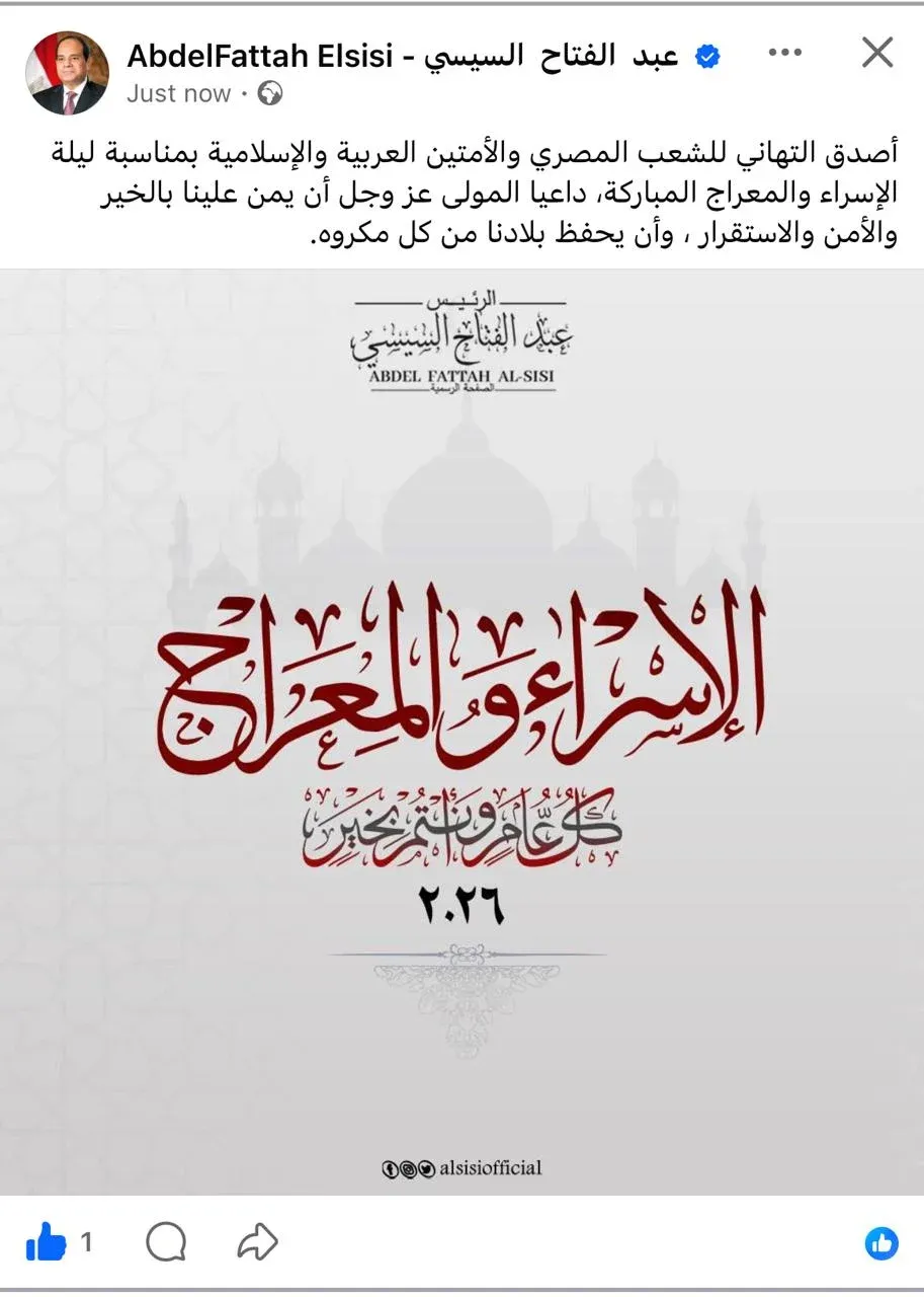 عبد الفتاح السيسي، الشعب المصري، والأمتين العربية والإسلامية؛ بمناسبة ليلة الإسراء والمعراج المباركة.
