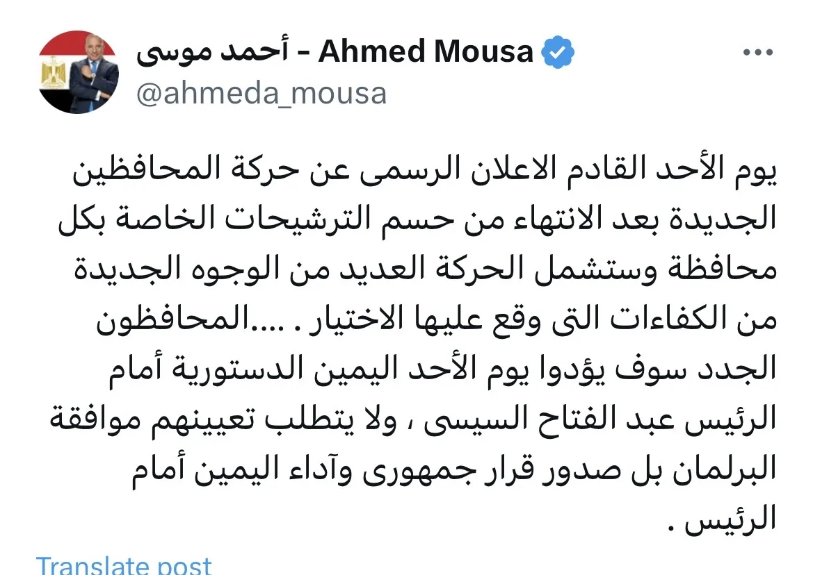 وأوضح موسى، عبر حسابه على منصة «إكس»، أن الحركة المرتقبة ستضم عددًا من الوجوه الجديدة من الكفاءات التي تم الاستقرار عليها لتولي المسؤولية في عدد من المحافظات.